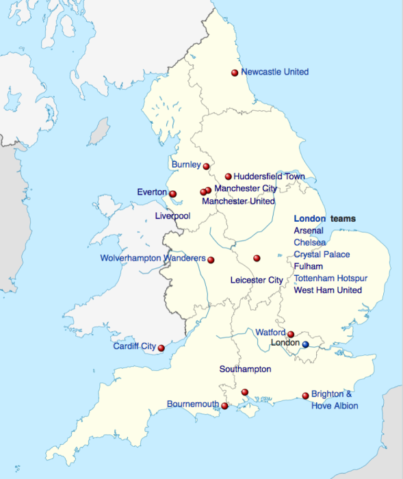 Premier League Team Locations Map English Premier league 2023/24 map : r/MapPorn: Preview: Fleetwood vs. Aston Villa U21s – prediction, team news, lineups Preview: Wigan vs. Morecambe – prediction, team news, lineups Preview: Leyton Orient vs. Arsenal U21s – prediction . We could simply name the best player from every Premier League team, but we want to go a bit deeper. What about every team’s X-factor? They aren’t the best player. They aren’t the superstar .